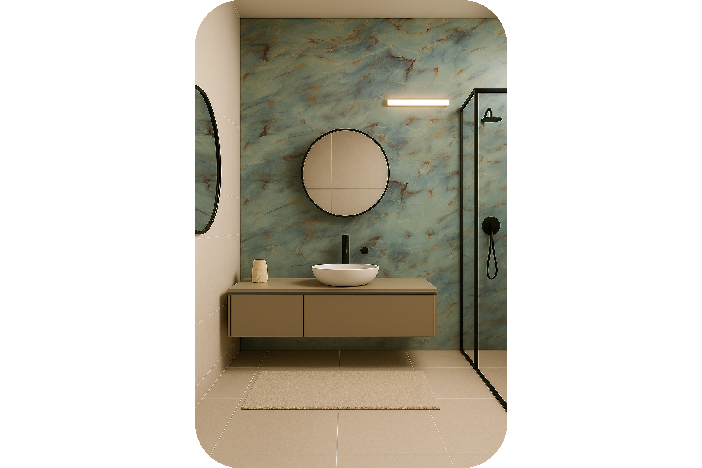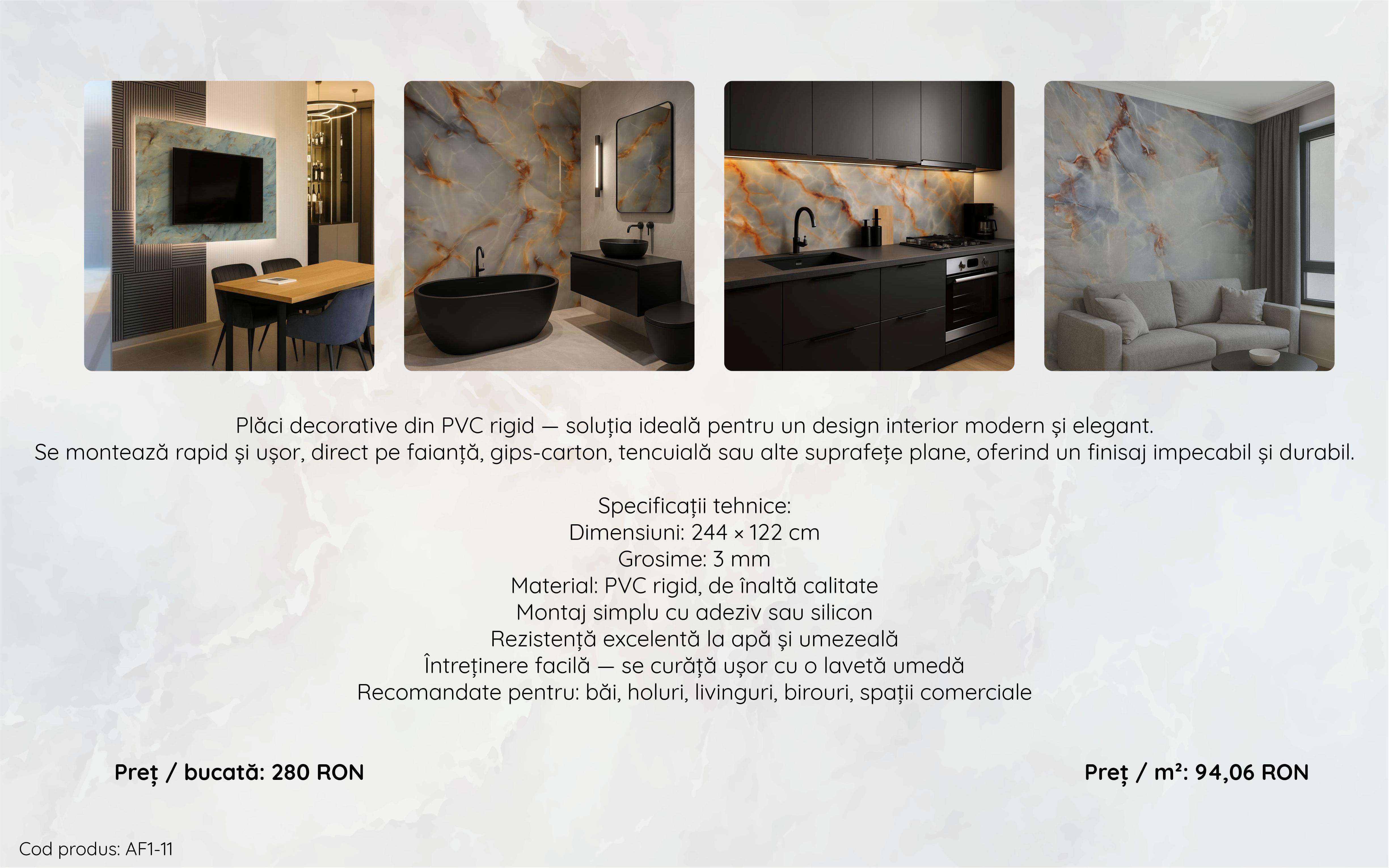 Se montează rapid si ușor, direct pe faianță, gips-carton, tencuială sau alte suprafețe plane, oferind un finisaj impecabil si durabil.