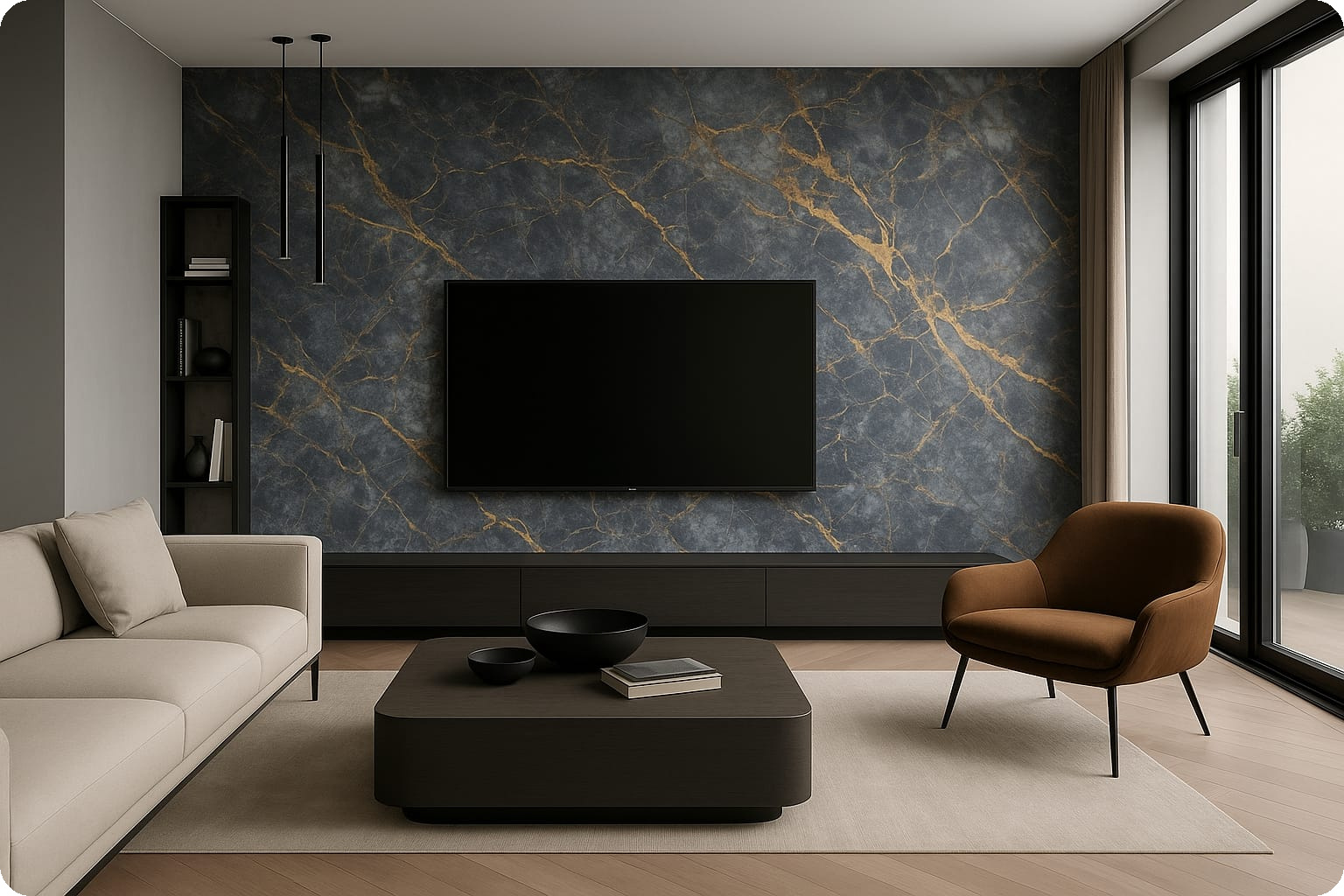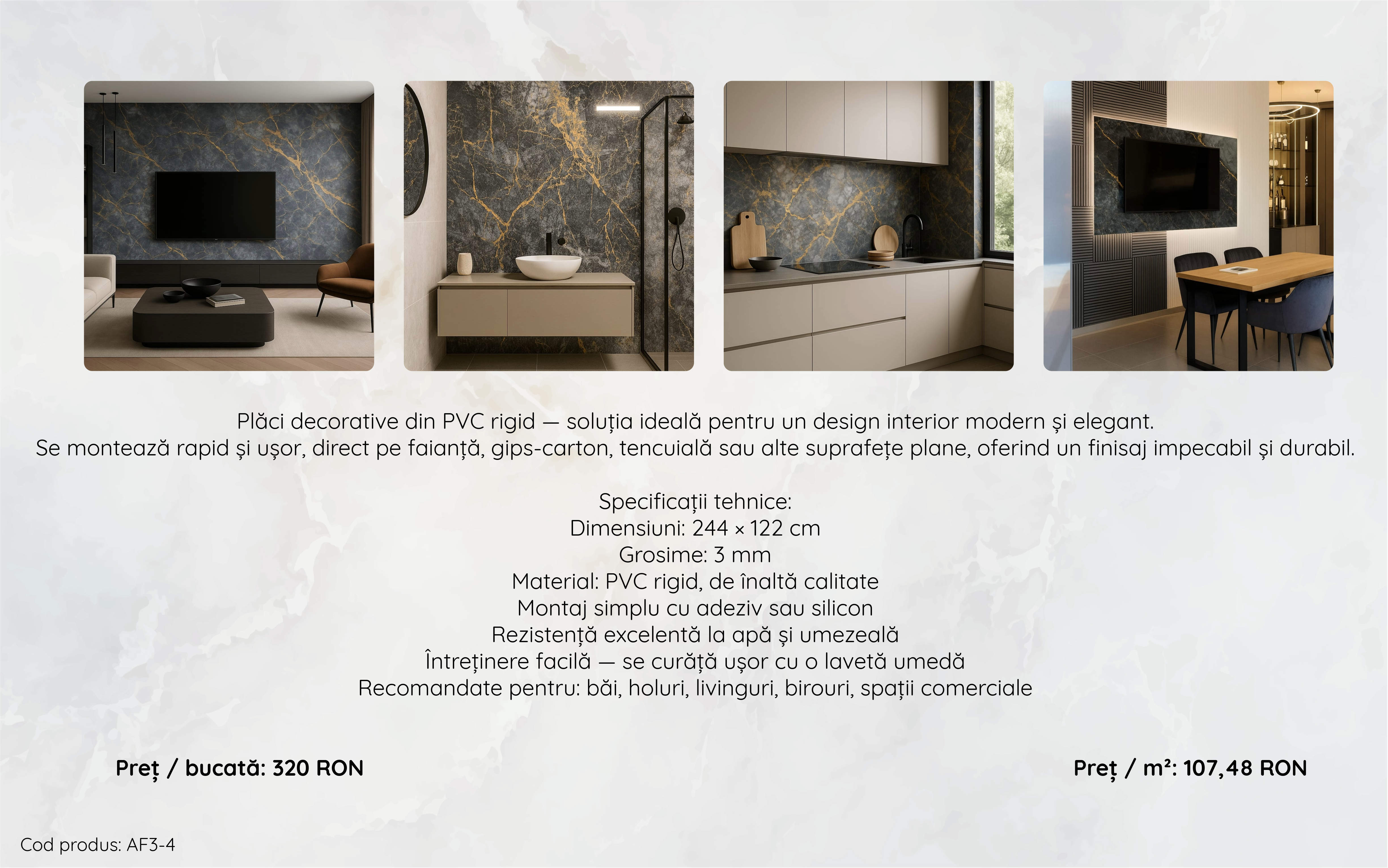 Un element decorativ elegant și modern, ideal pentru interioare sofisticate. Panoul PVC albastru inchis, combinat cu inserțiile aurii, adaugă un plus de rafinament și stil oricărui spațiu, fie că este vorba de locuințe, birouri sau spații comerciale.