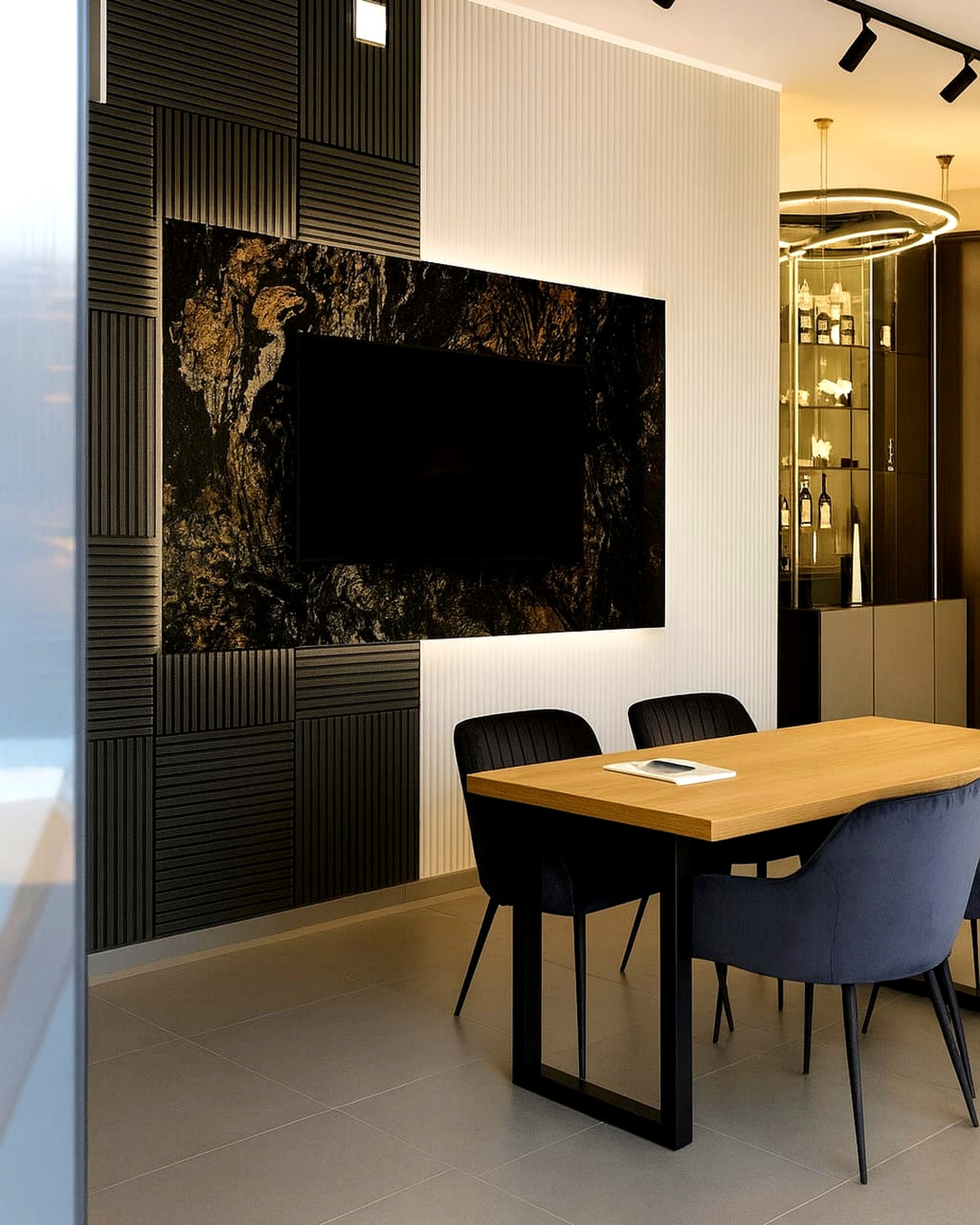 Un element decorativ elegant și modern, ideal pentru interioare sofisticate. Panoul PVC negru, combinat cu inserțiile aurii, adaugă un plus de rafinament și stil oricărui spațiu, fie că este vorba de locuințe, birouri sau spații comerciale.