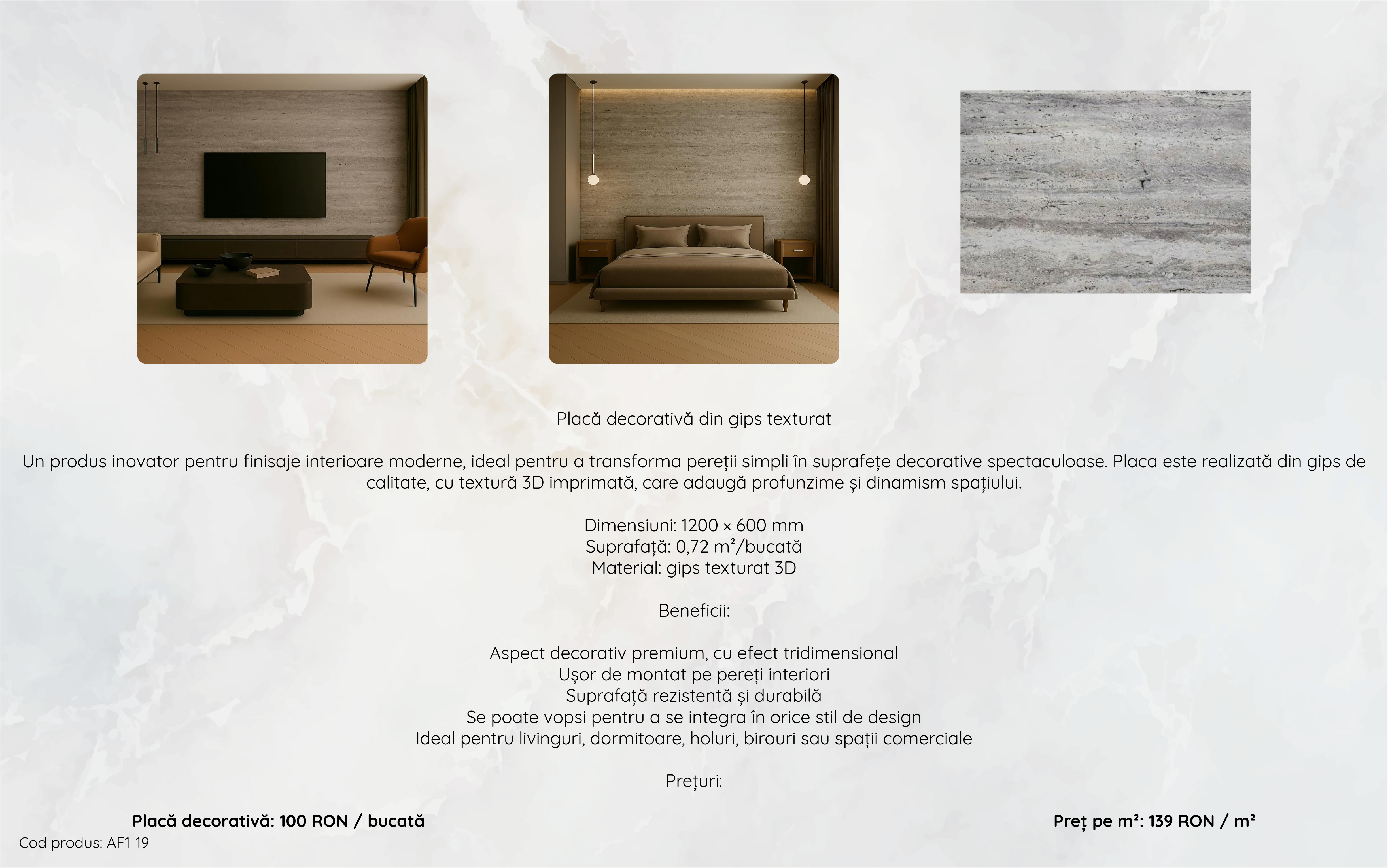Un produs inovator pentru finisaje interioare moderne, ideal pentru a transforma peretii simpli în suprafete decorative spectaculoase. Placa este realizatà din gips de calitate, cu textură 3D imprimatã, care adaugã profunzime si dinamism spatiului.